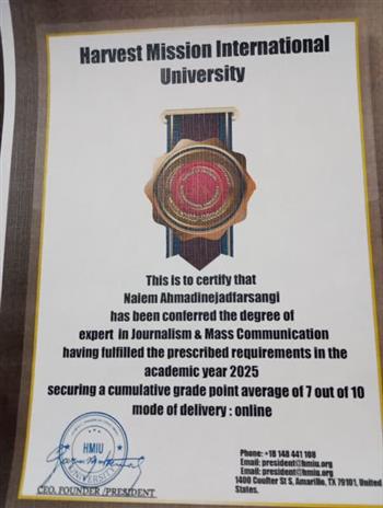«دانشگاه بینالمللی هاروست میسیون یکی از مراکز برجسته آموزشی و پژوهشی در ایالات متحده آمریکا است که با رویکردی بینالمللی و جامع به تعلیم و تربیت دانشجویان در سراسر جهان میپردازد. بنده به صورت کاملاً آنلاین در کلاسهای درسی این دانشگاه شرکت کردم و پس از موفقیت در آزمون نهایی و کسب نمره ۷ از ۱۰، موفق به دریافت این مدرک معتبر شدم.»